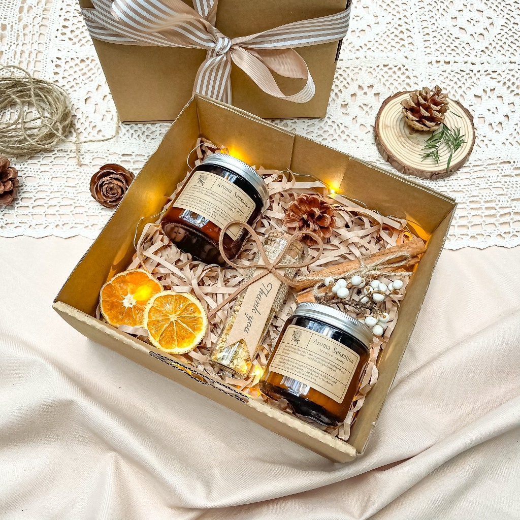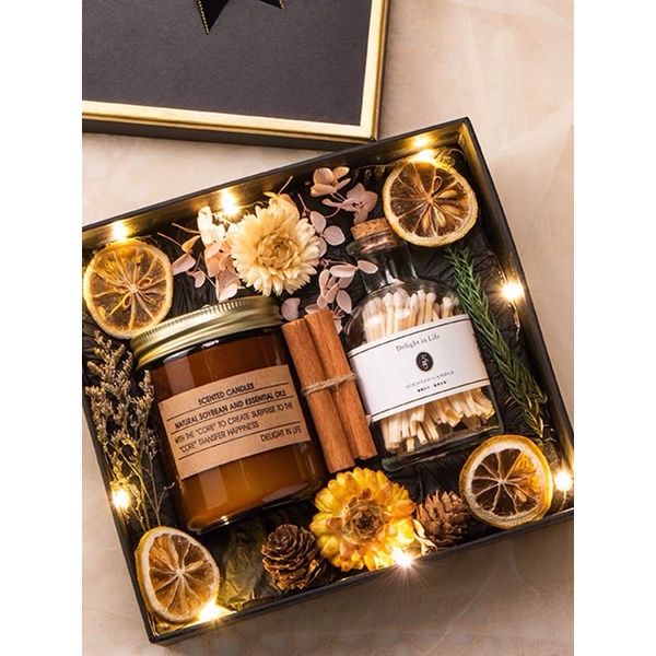 Dành cho những ai thích sự giản dị. Set quà gồm nến, charm nhỏ, hoa khô mini trong hộp giấy kraft vintage – thích hợp tặng sinh nhật bạn gái hoặc đồng nghiệp.