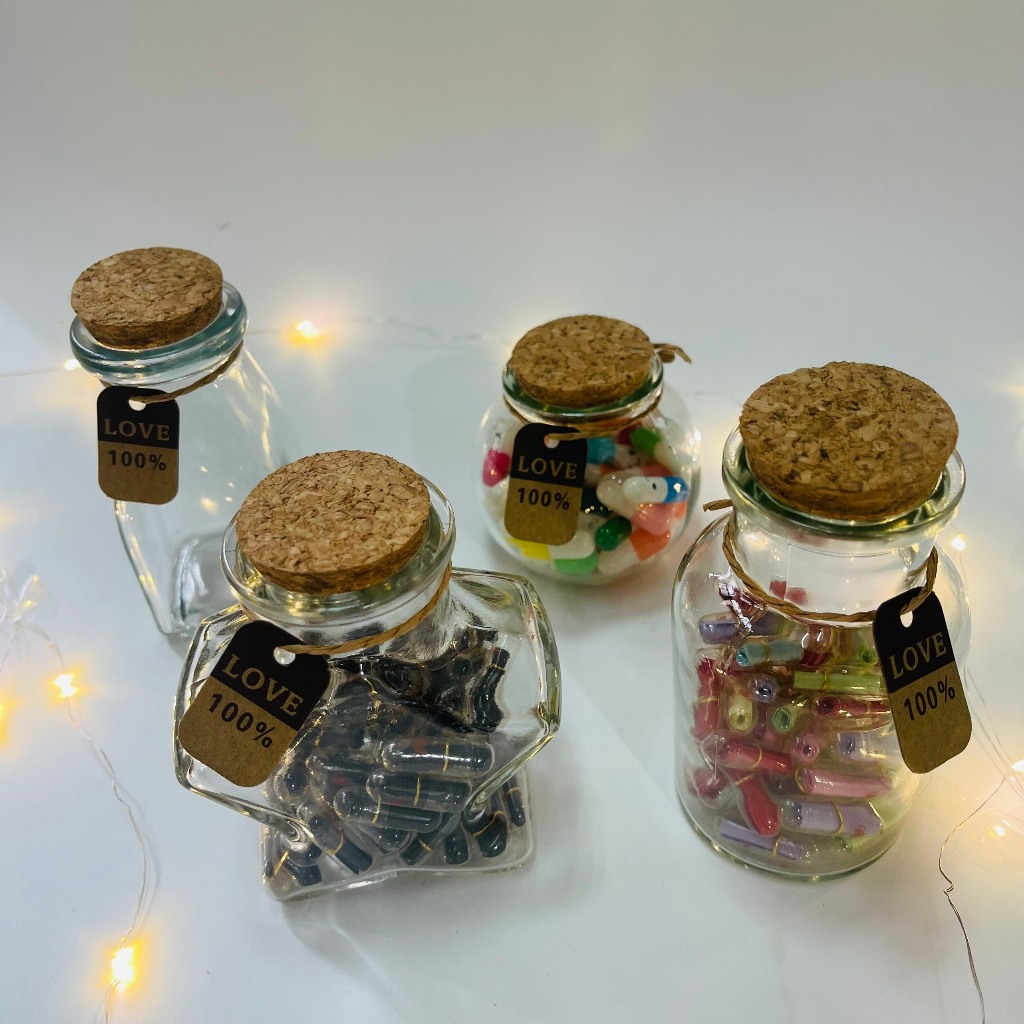 Lọ điều ước thủy tinh 100ml được buộc bằng dây thừng vintage xinh xắn, bên trong là những mảnh giấy nhỏ để viết điều ước, lời chúc hay những kỷ niệm đáng nhớ.